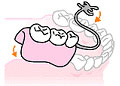 また、部分入れ歯の場合、入れ歯を入れる両サイドの歯にバネのようなものをかけます。これをかけることにより、入れ歯を固定します。しかし、支えにされた方の歯はたまったものではありません。咬む度に、上下左右に揺さぶられ、力を加えられ続けます。刺さった釘でも、長い時間をかけて上下左右に揺さぶられると、抜けてしまうのと同じように、バネをかけられてしまった歯は5年以内に抜けてしまうことが多いようです。バネをかけていた歯が抜けてしまうと、その分、部分入れ歯を大きくして、次の歯にバネをかけ、またバネをかけていた歯が抜けて、ということを繰り返し、総入れ歯に着実に近づいてしまうことになるのです。
