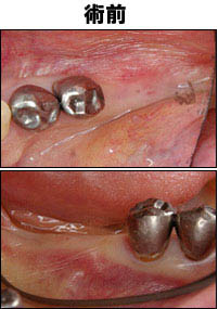 そのため歯のない部分が2本分になり一番奥の歯が無いので、固定式の歯で治療するのが困難な状態になりました。通常は取り外しの入れ歯になります。それまで入れ歯を使用したことが無いWさんには抵抗があり、インプラントを使用し固定式の新しい歯を2本造ることになりました。ただ歯槽膿漏で歯茎の中の骨がやられていたため、そのままでは十分な骨の厚みが足りないので痩せた骨を再生させる処置を行い、造った骨が固まるまで6ヶ月待ちました。骨折したときに長い間ギブスで固定しないと治らないように、骨という組織は治るのに最も時間がかかるのです。しかもその造った骨にインプラントを入れないとならないので、安全の為しっかり待ちました。その甲斐あってしっかりした硬い骨ができ、インプラントが入りました。インプラントを入れる手術の次の日に旅行に行かれるようなこともありましたが、順調に治療が進み2本のインプラントの上に新しい歯が入りました。