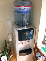 窓際においしいお水「PURE WATER」があります。是非、飲んでみて下さい。おいしいですよ。待ち時間が長くなってしまったとき、診療で疲れた時に、この水が疲れを癒してくれることでしょう。